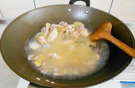 將雞去頭去尾,去除內(nèi)臟,清洗干凈,切成3厘米左右大小的塊狀,在滾水里焯過(guò)瀝干水分。生姜去皮切片,準(zhǔn)備米酒,麻油備用。