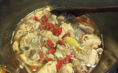 20分鐘后放入一把枸杞,放入適量食鹽,繼續(xù)煮5分鐘左右,即可出鍋。