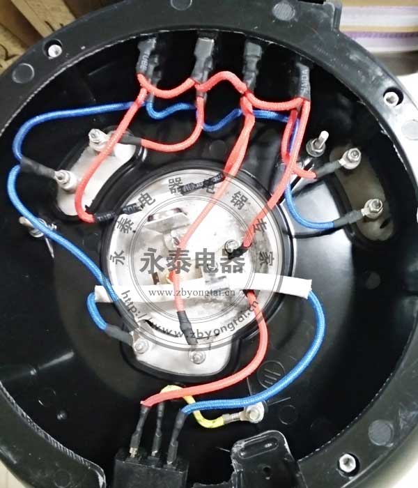 電熱鍋還壞不能只看外表,打開底座看一下內部,內有兩個溫控器,內線很粗,插接處都有絕緣材料包裹,很整齊,質量不錯。